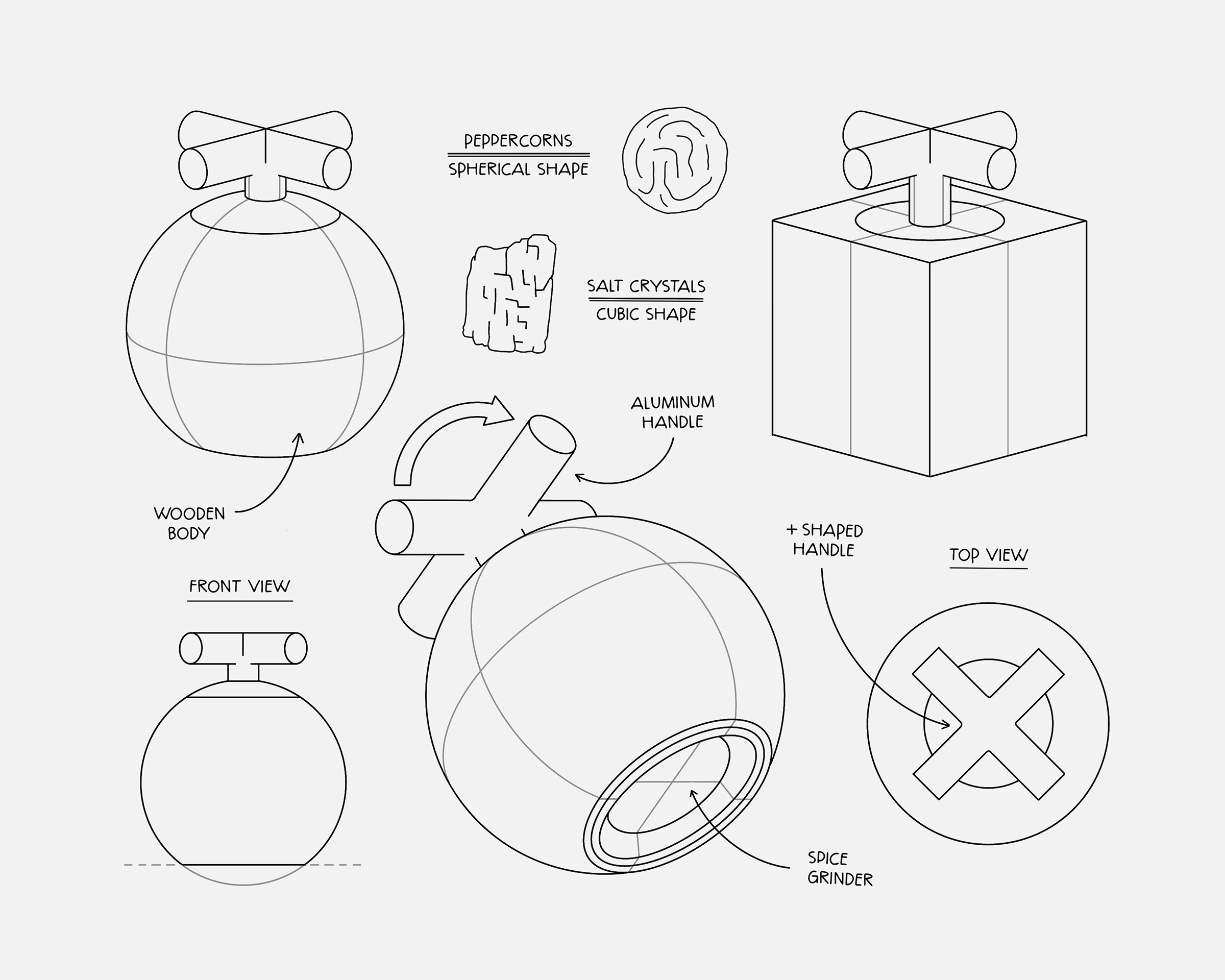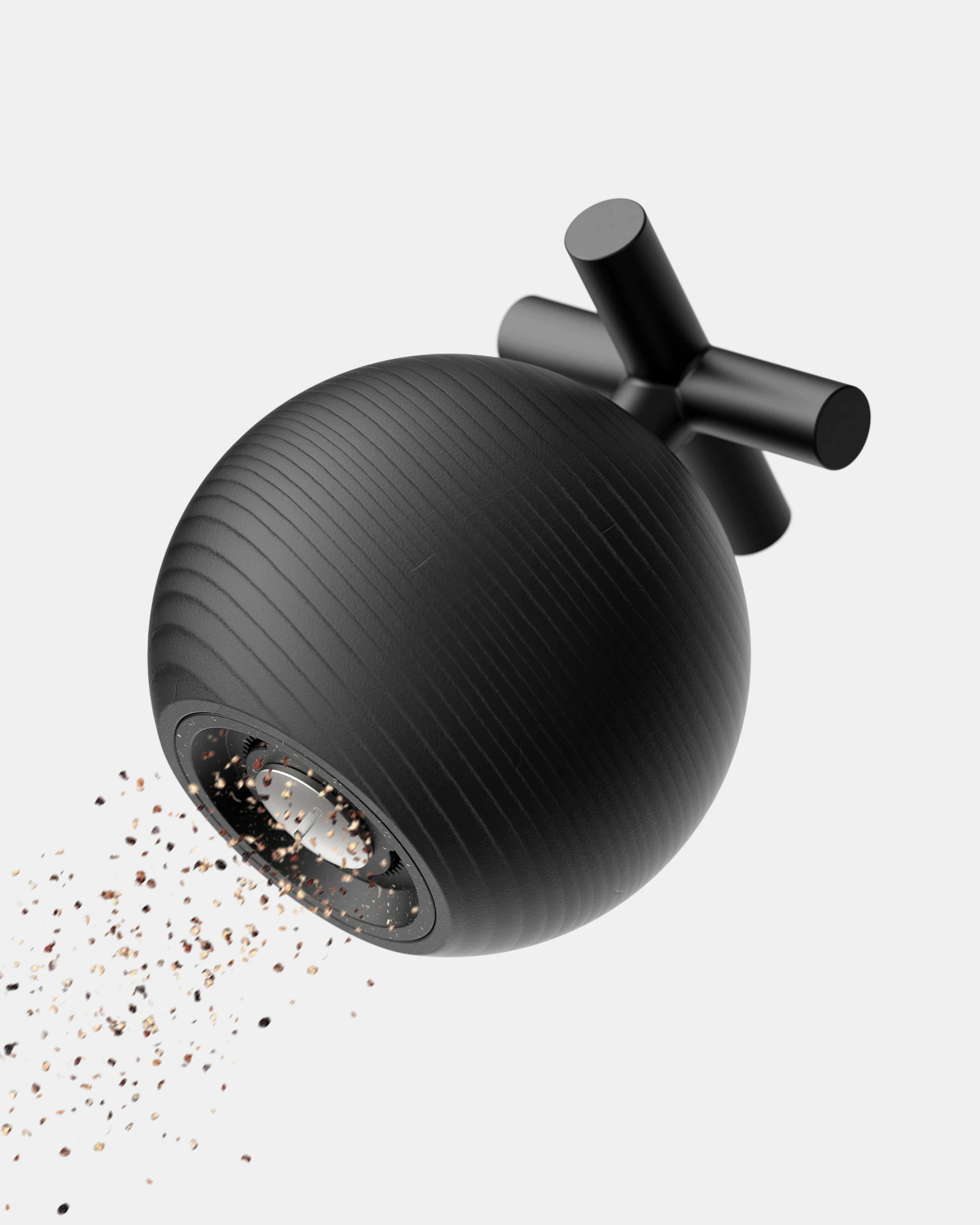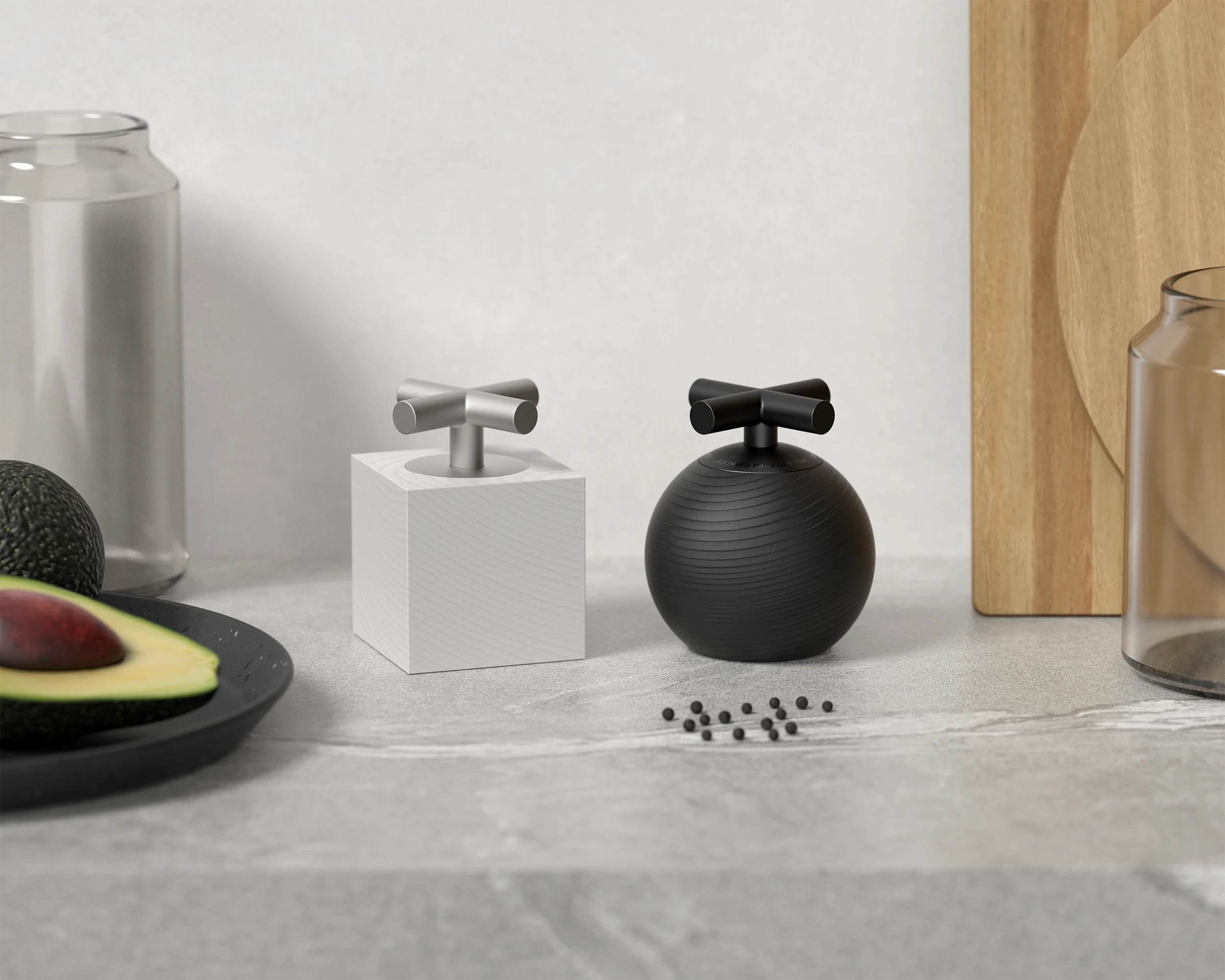 What sets Elements apart is its thoughtful use of shape and symbolism. The salt grinder takes on a crisp cubic form, echoing the geometric structure of salt crystals, while the pepper grinder embraces a smooth, spherical silhouette, mirroring the natural form of peppercorns. This contrast in design not only enhances their visual appeal but also reinforces their individual identities in a way that is both intuitive and artistic.